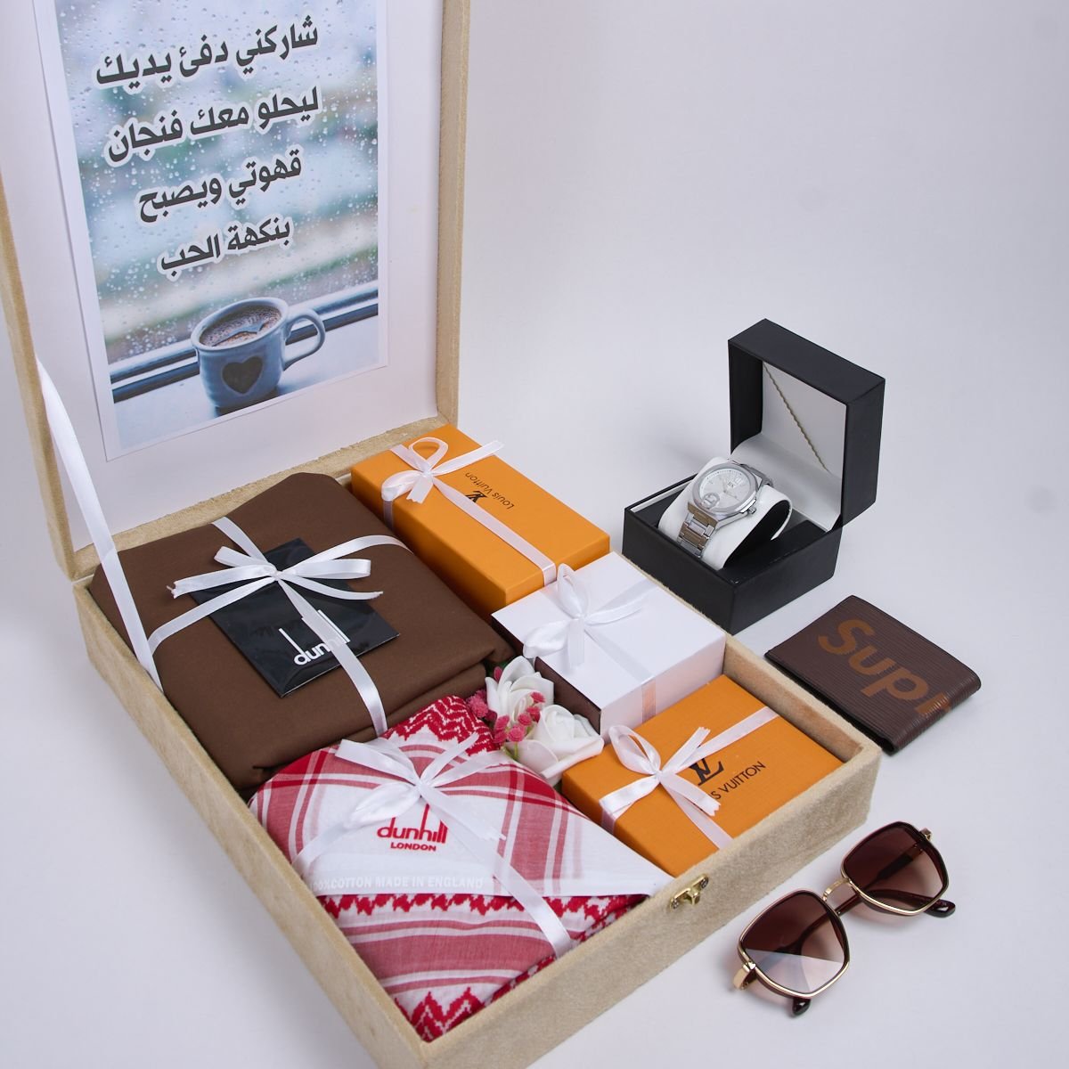 بوكس هدية رجالي شتوي مع تغليف هدايا فخم شماغ Dunhill، قماش أنيق، ساعة أصلية بضمان، محفظة جلد ماركة، ونظارة شمسية، بتغليف فاخر يناسب جميع المناسبات الخاصة.”