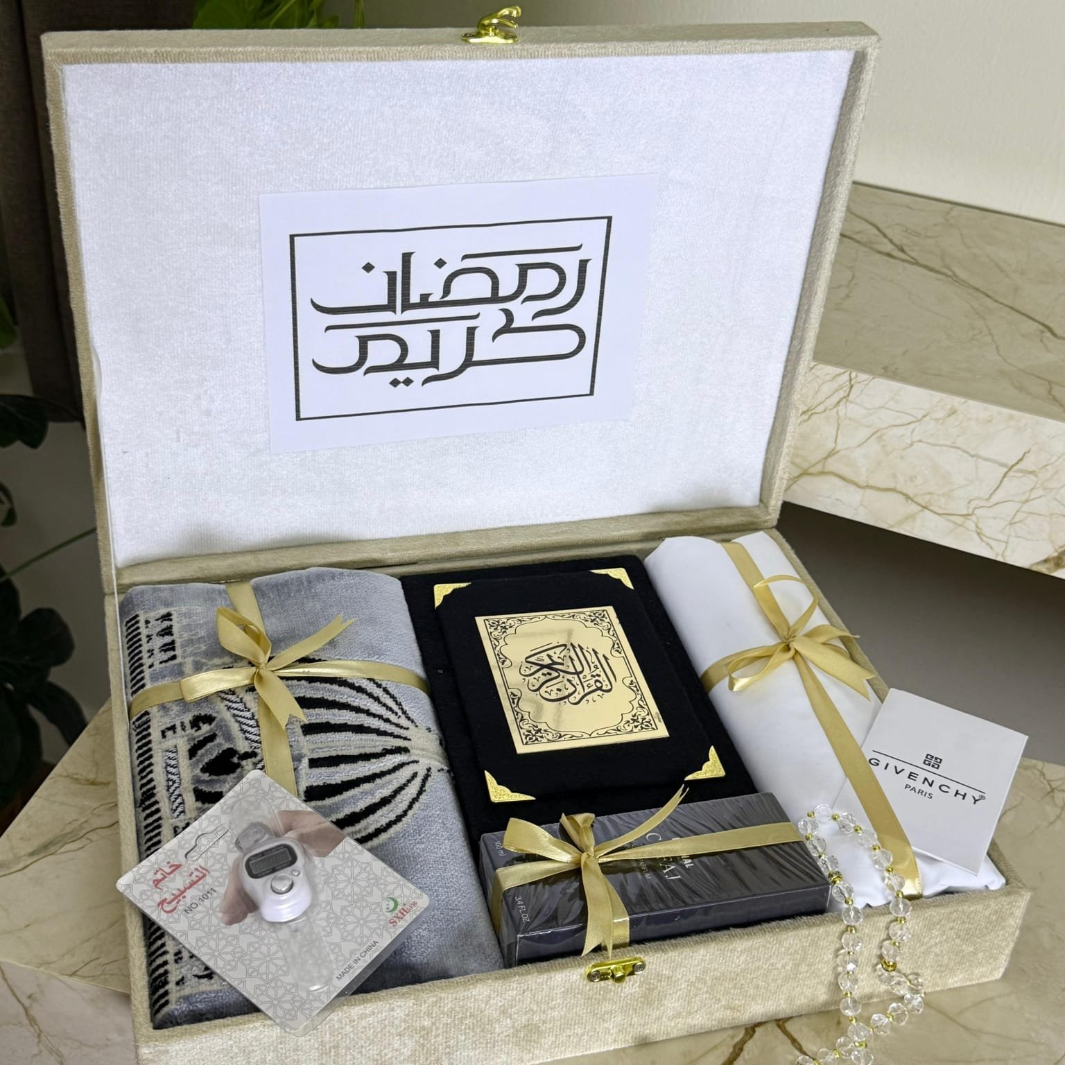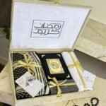 بوكس هدية رمضان رجالي فاخر – يحتوي على قماش جفنشي، مصحف، سجادة صلاة، عطر وسبح. عرض خاص لفترة محدودة مع توصيل مجاني داخل الرياض