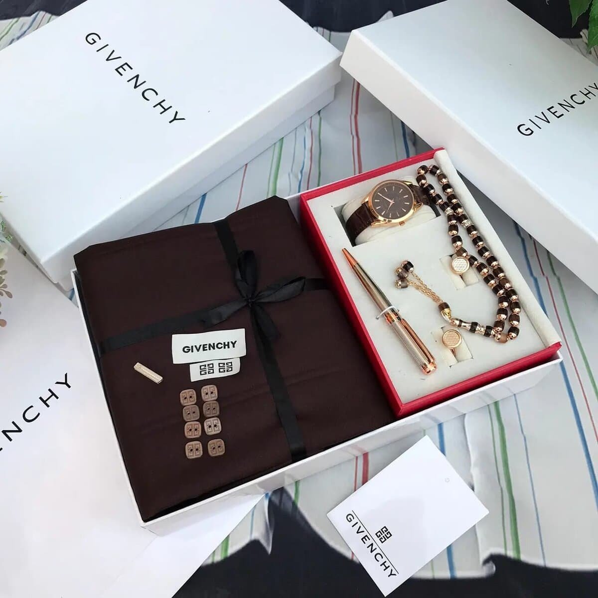 طقم هدية رجالي شتوي طقم رجالي جيفنشي فاخر يحتوي على ساعة، كبك، قلم، سبحة، وقماش ثوب مع الملحقات الأصلية. خيار مثالي للإهداء مع توفر التوصيل والشحن.