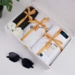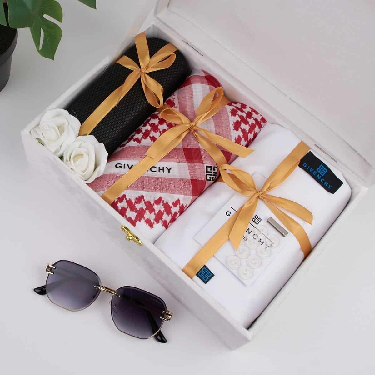 هدية رجالية  بوكس هدايا مع قماش بخيارات متنوعة، شماغ أصلي، ونظارة شمسية مع جميع الملحقات الأصلية. الهدية المثالية للمناسبات الخاصة بتغليف راقي وخيارات مخصصة.